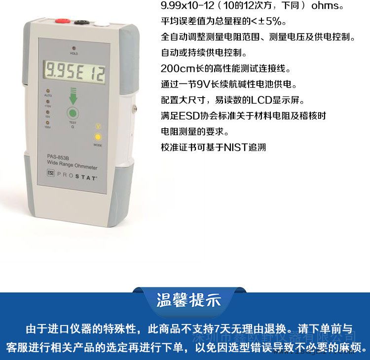 美国PROSTAT重锤式电阻测试仪/静电电阻监测仪PAS-853B